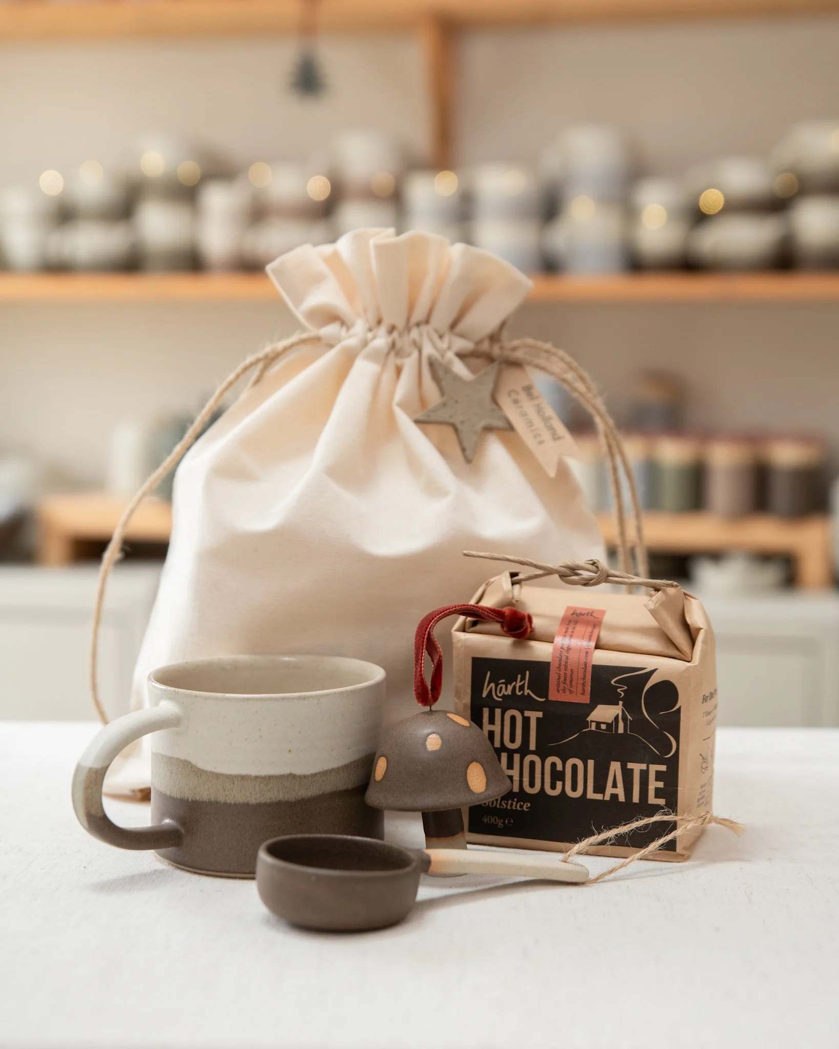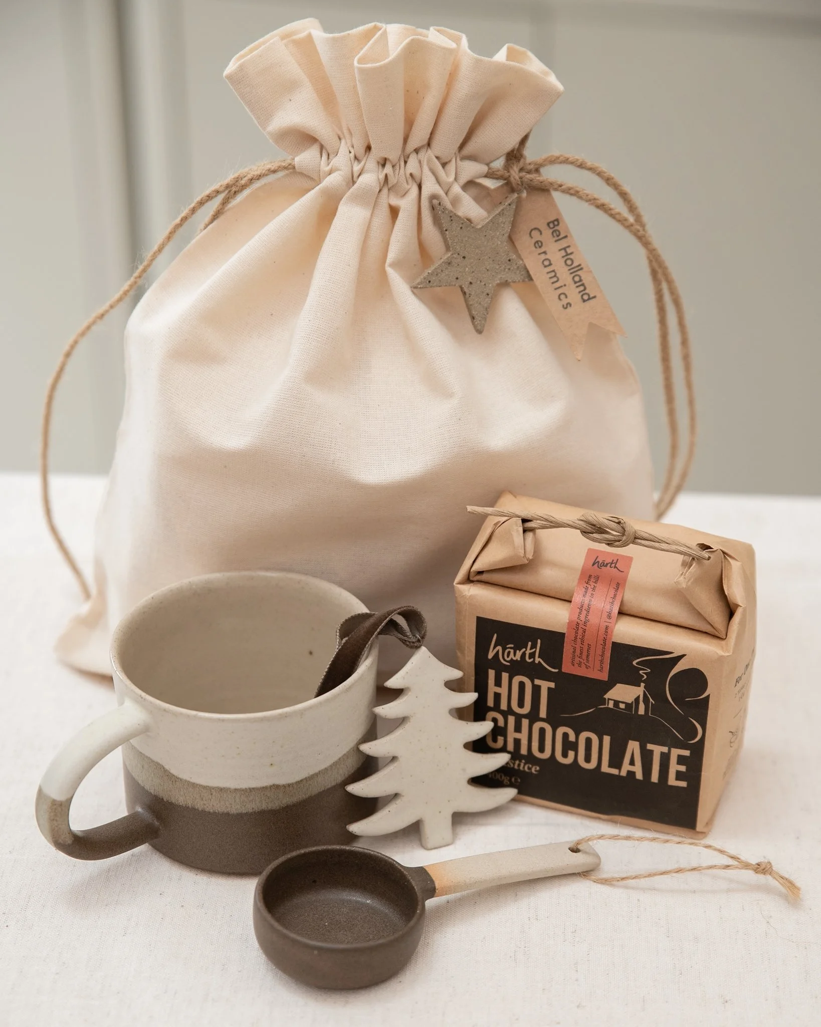 This Mug Gift bag includes a free handmade drawstring gift bag adorned with a label and natural ceramic star. These are filled with a mug, Harth hot chocolate, Tbsp scoop and a ceramic hanging decoration with velvet ribbon.