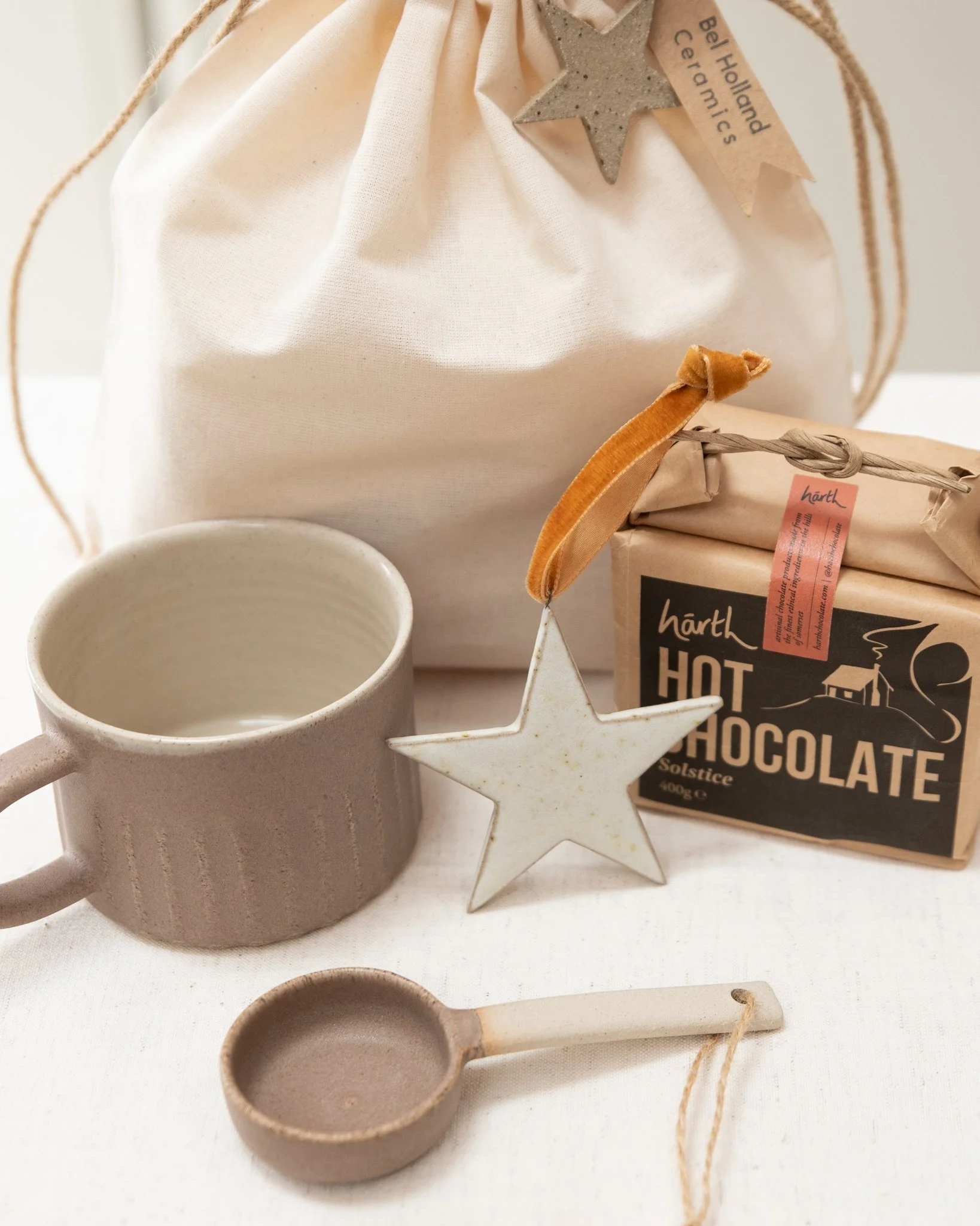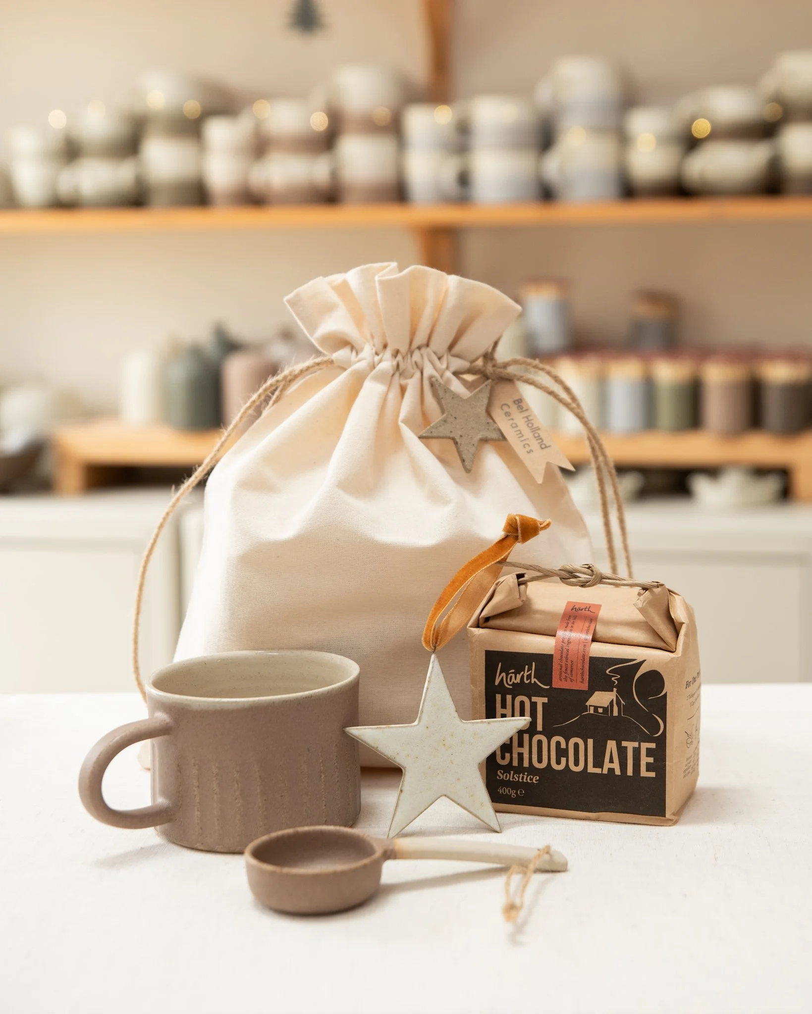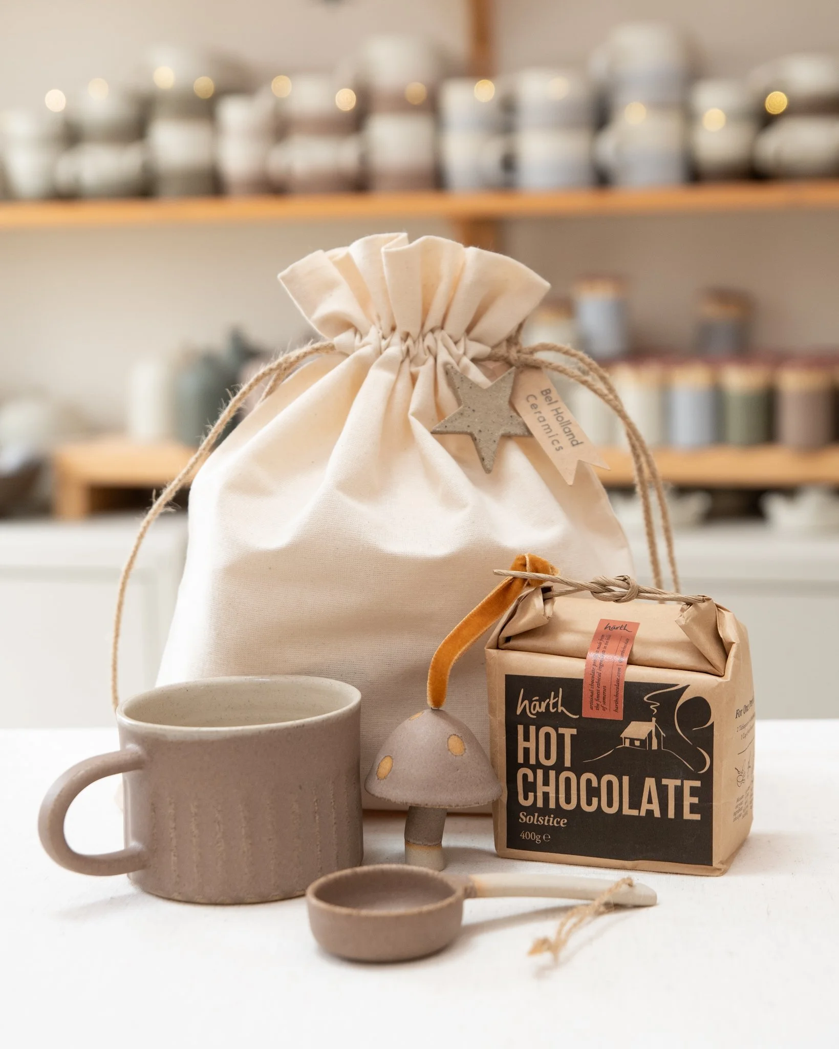 This Mug Gift bag includes a free handmade drawstring gift bag adorned with a label and natural ceramic star. These are filled with a mug, Harth hot chocolate, Tbsp scoop and a ceramic hanging decoration with velvet ribbon. There is a choice of either a star or toadstool decoration.