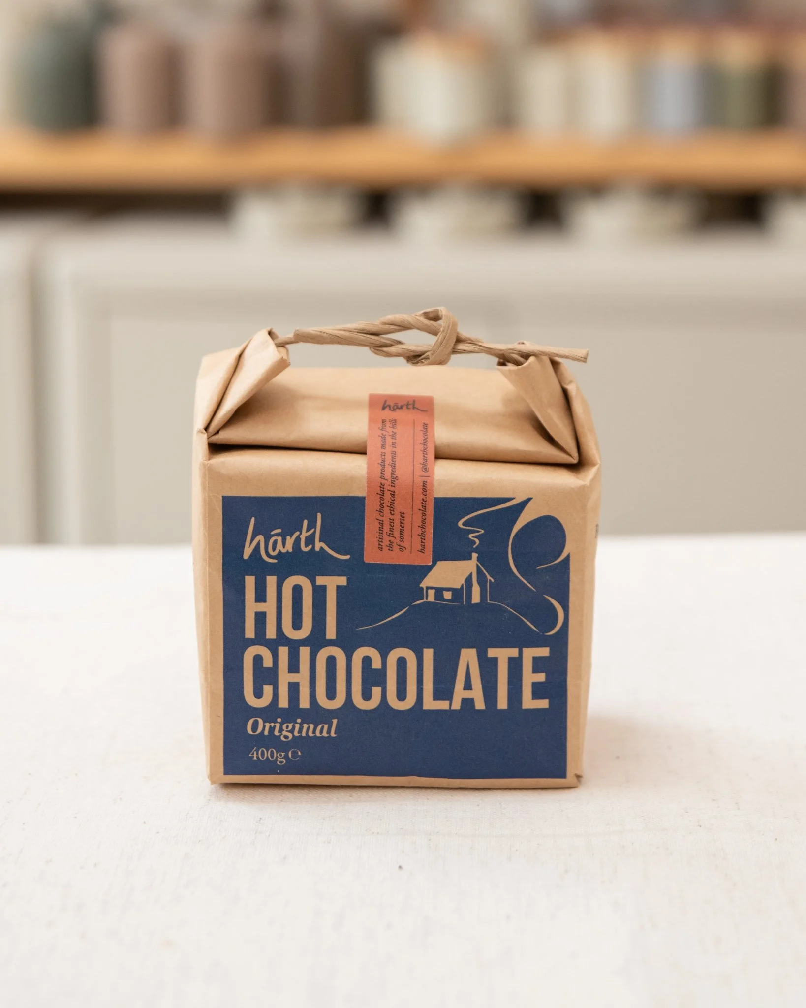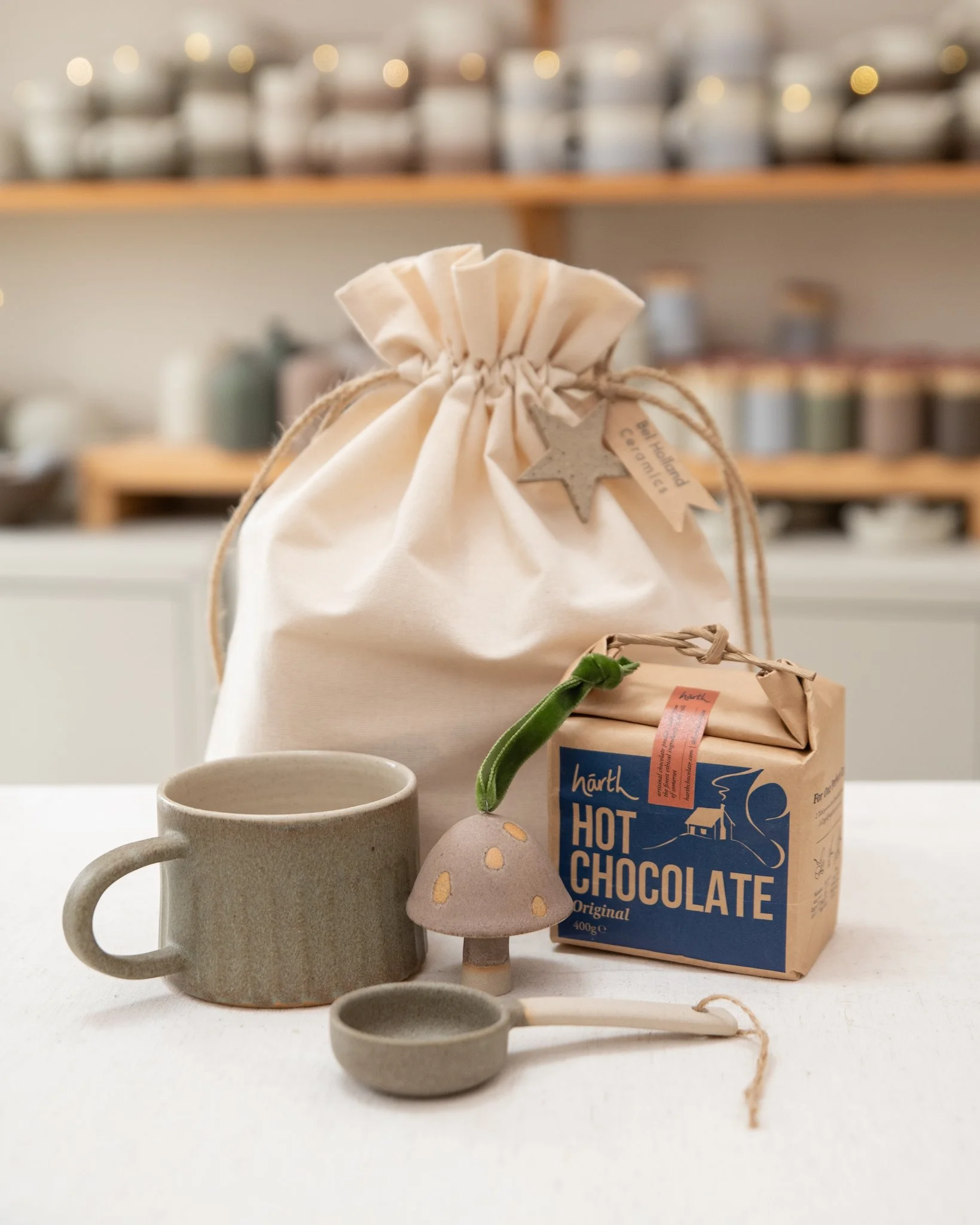 This Mug Gift bag includes a free handmade drawstring gift bag adorned with a label and natural ceramic star. These are filled with a mug, Harth hot chocolate, Tbsp scoop and a ceramic hanging decoration with velvet ribbon.