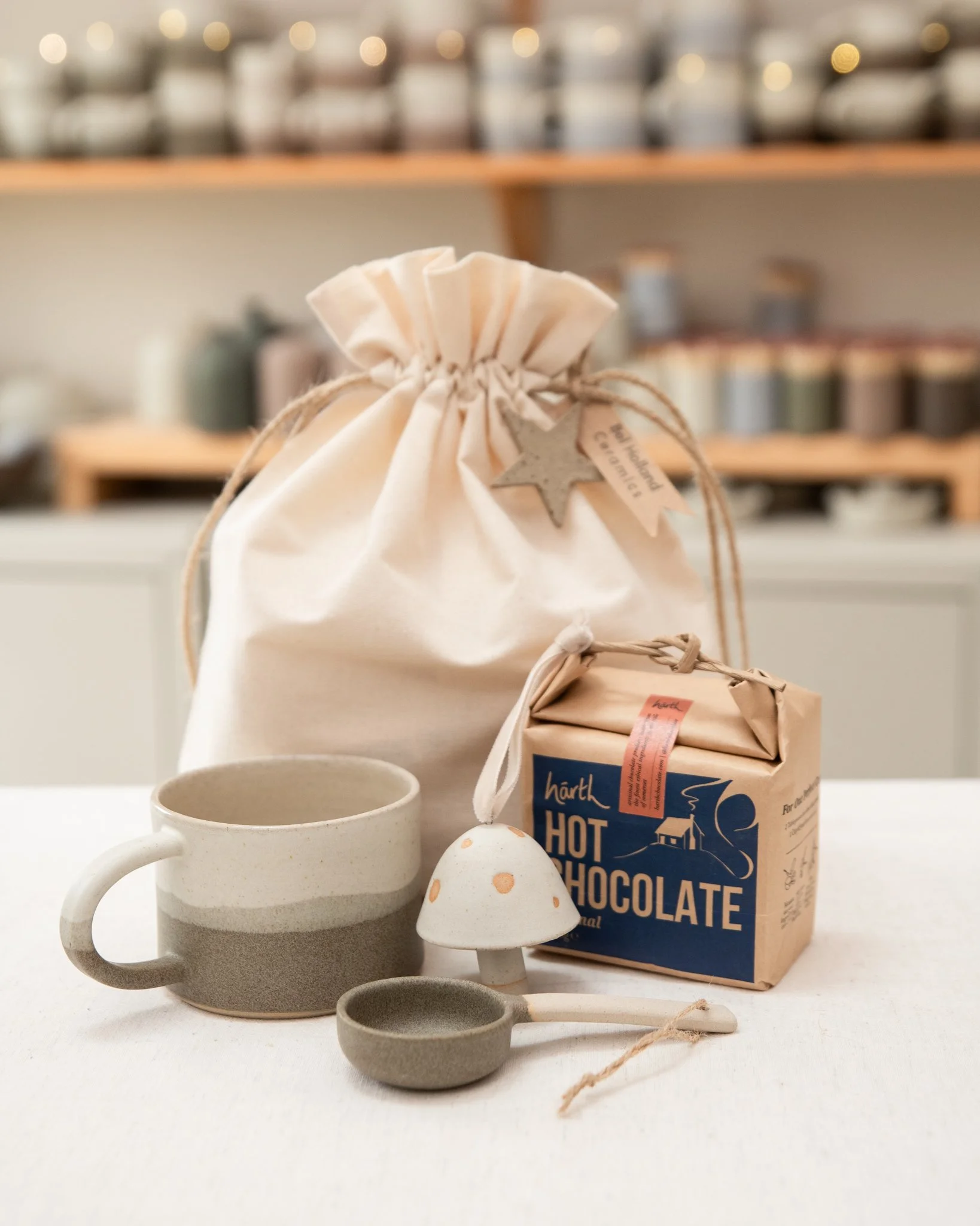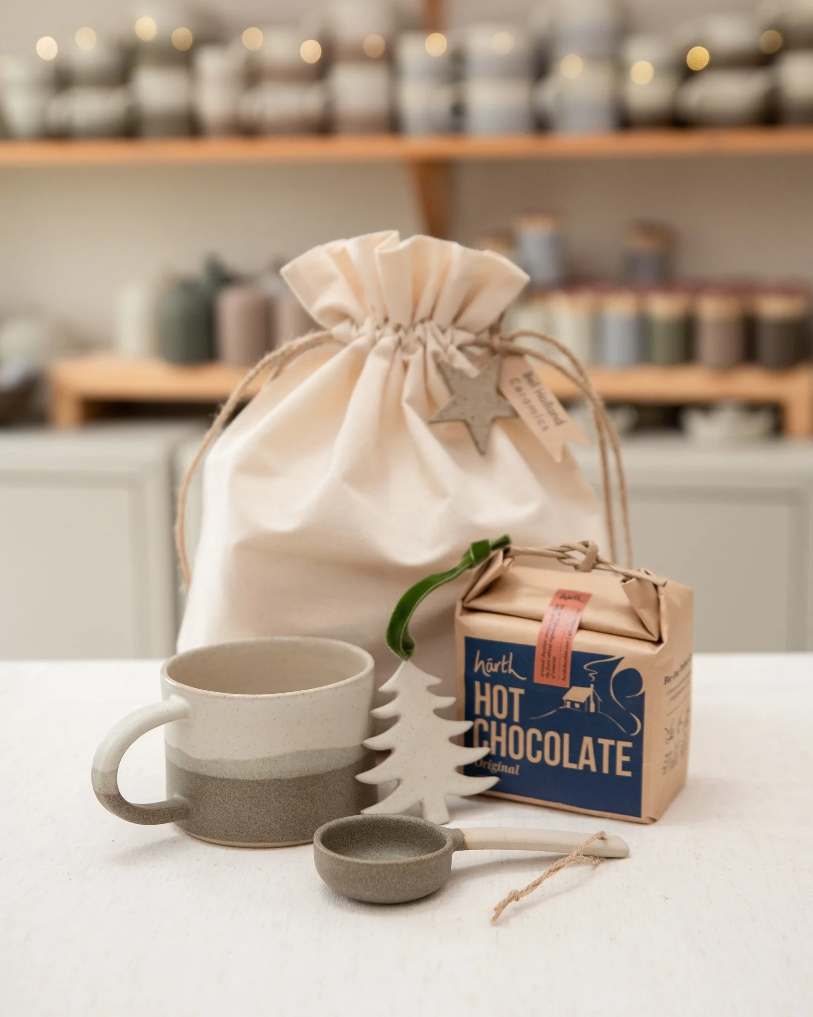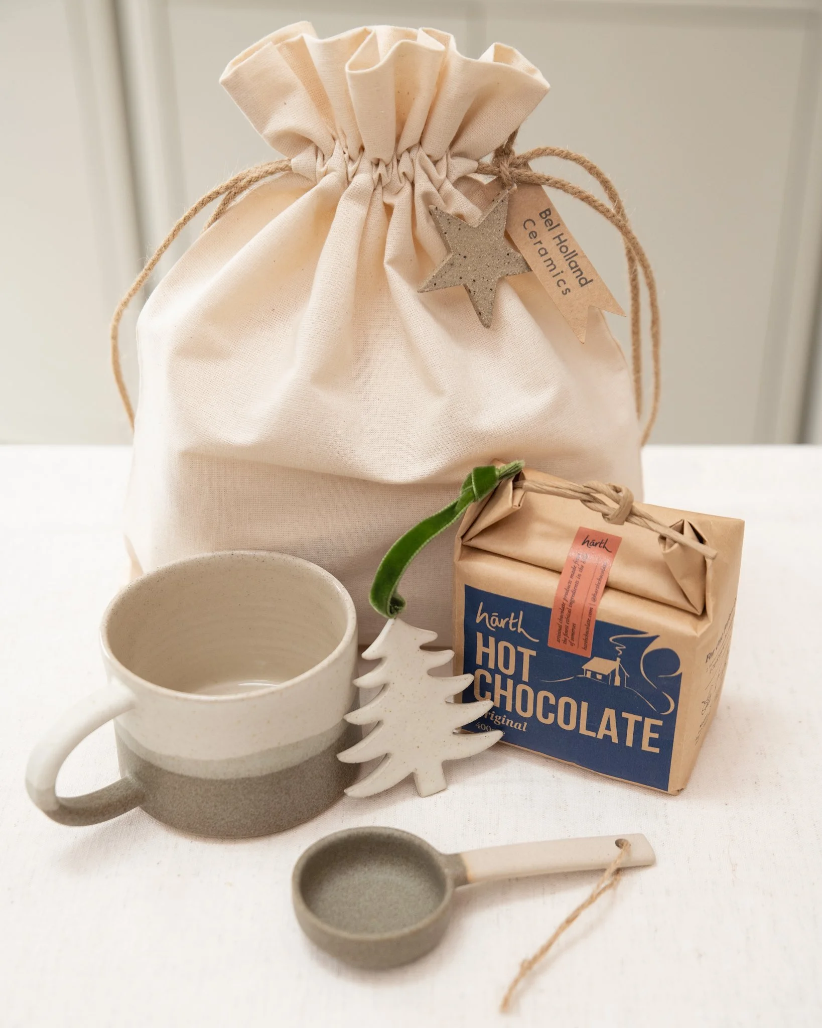 This Mug Gift bag includes a free handmade drawstring gift bag adorned with a label and natural ceramic star. These are filled with a mug, Harth hot chocolate, Tbsp scoop and a ceramic hanging decoration with velvet ribbon.