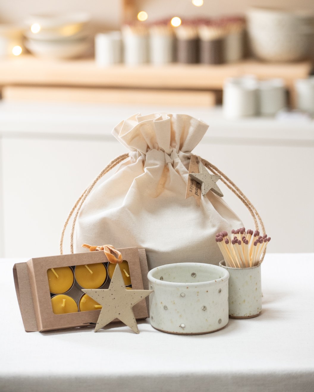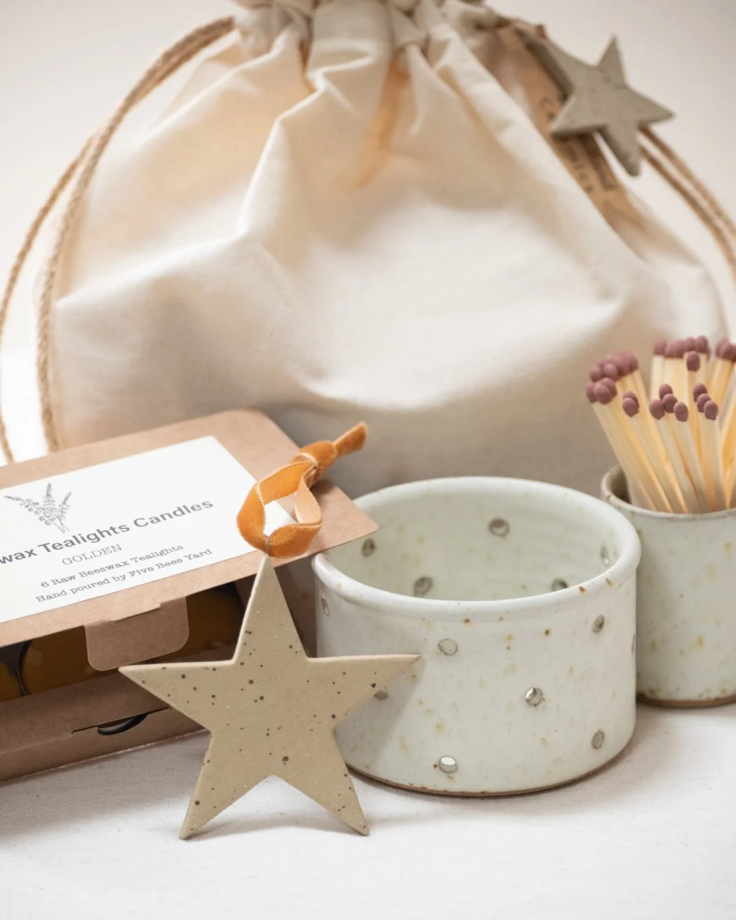 This Tealight Gift bag includes a free handmade drawstring gift bag adorned with a label and natural ceramic star. These are filled with a Tea-Light holder, hand poured beeswax tea lights in a set of 6, a mini match pot with matches and a striker and a ceramic hanging decoration with velvet ribbon.
