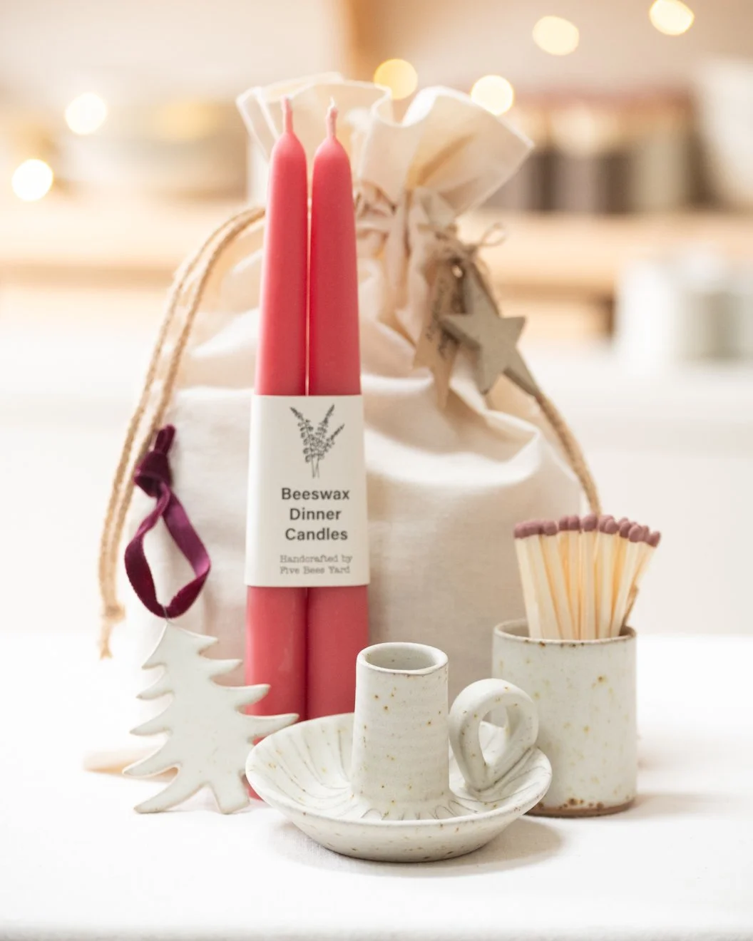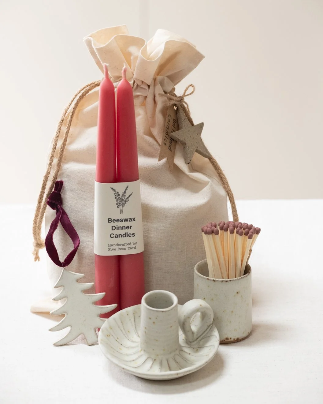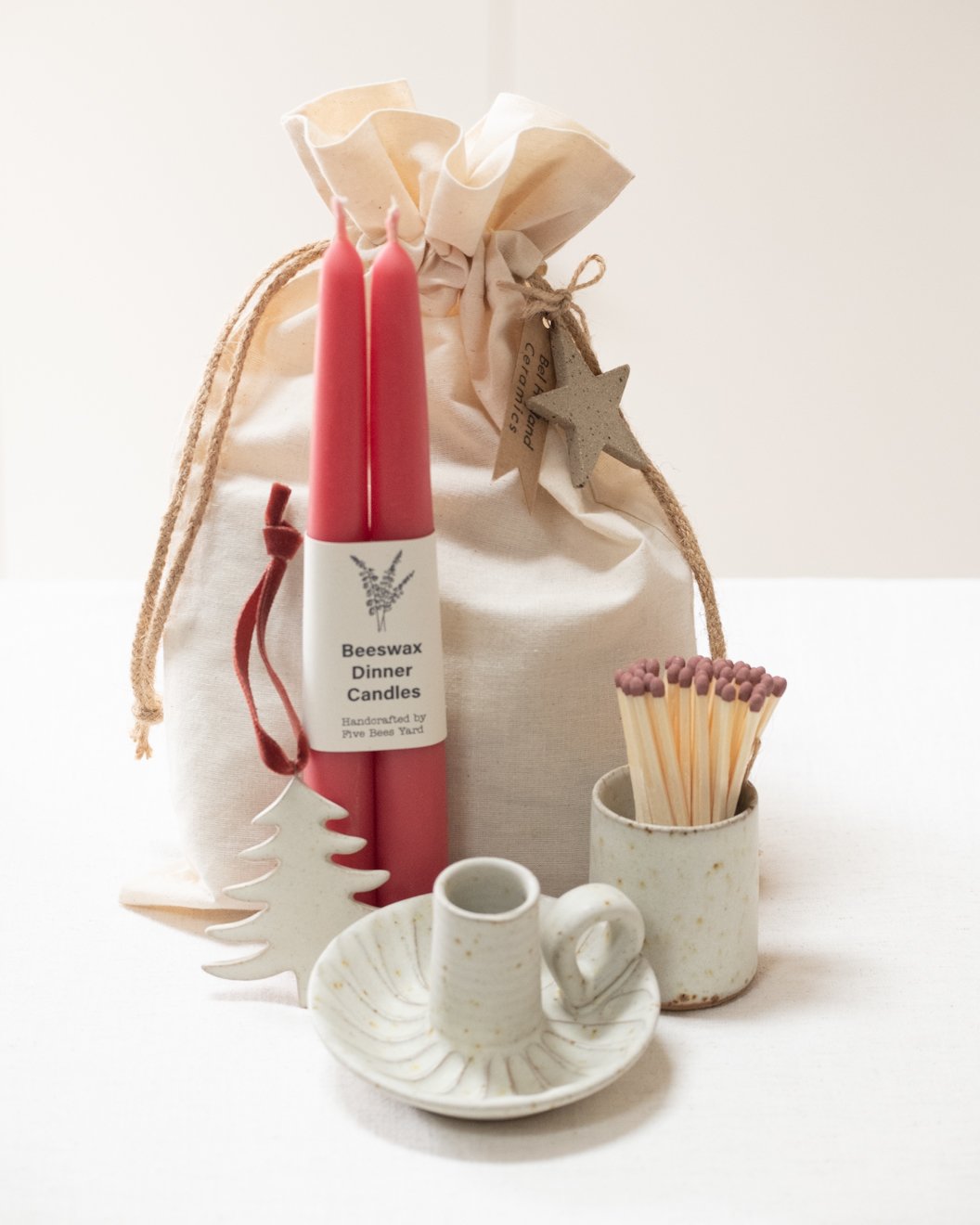 This Candle Holder Gift bag includes a free handmade drawstring gift bag adorned with a label and natural ceramic star. These are filled with a fluted candle holder, handmade beeswax candles, a mini match pot with matches and a striker and a ceramic hanging decoration with velvet ribbon.